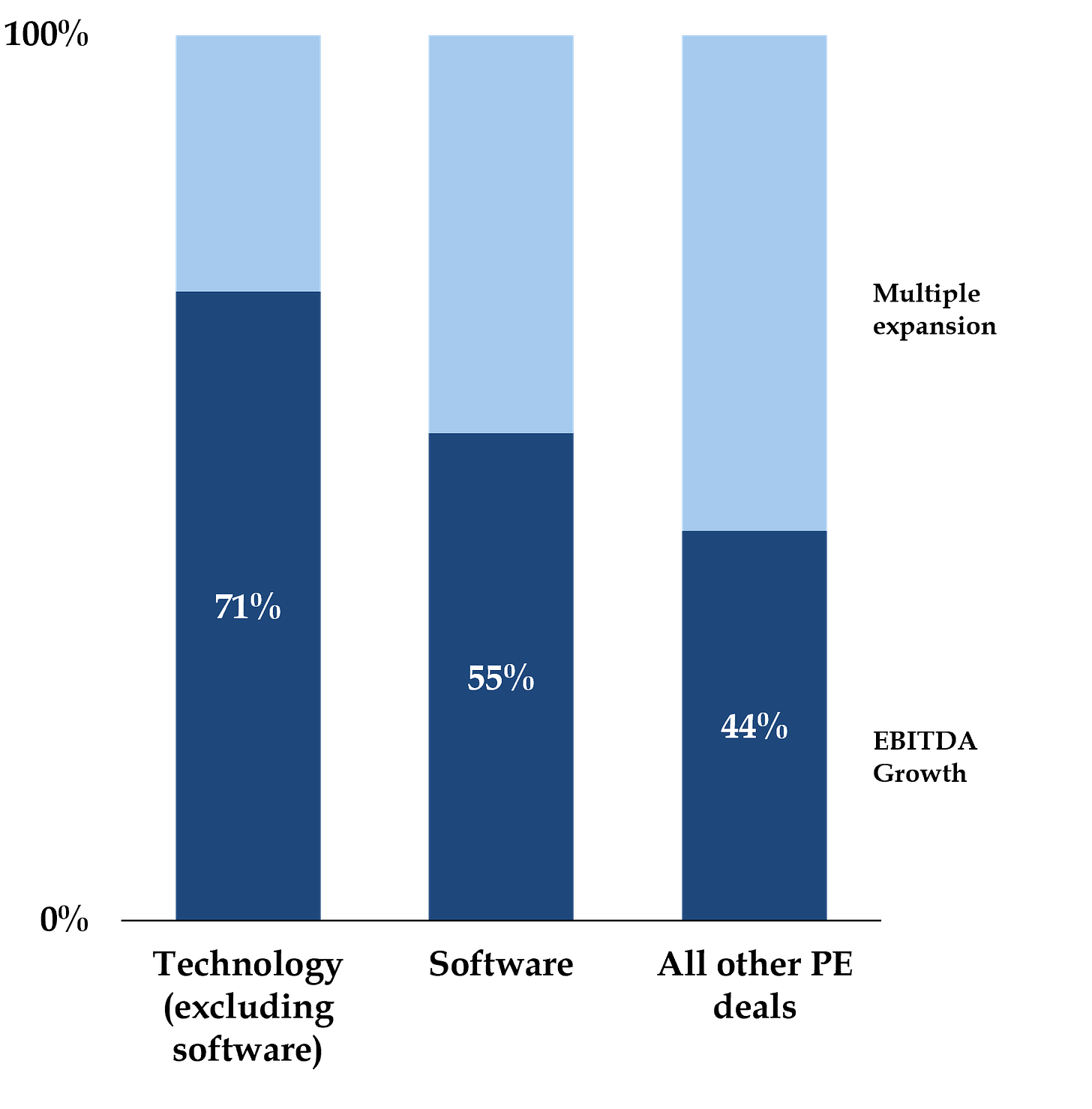 the vast majority of exits were to other private equity funds, leading to a self-fulfilling prophecy and recycling of portfolio companies at higher multiples (multiple expansion drove more than 50% of historical returns).