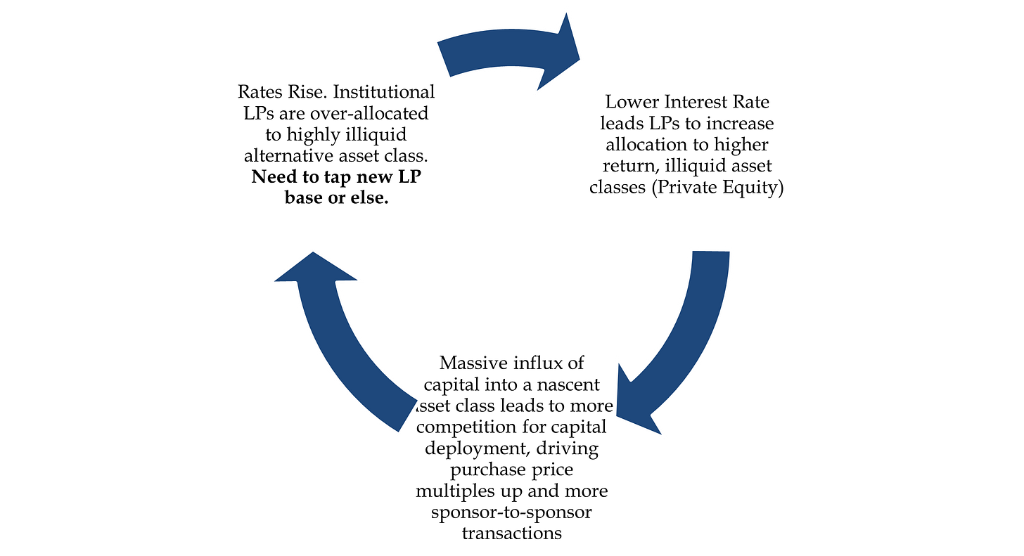 The three prior points are very much intertwined. Low-interest rates decreased returns from fixed-income, which led underfunded pensions to look for higher-yield asset classes, such as private equity. The increase in capital allocations led to the expansion of the industry, which increased competition for deals, driving up purchase price multiples. At some point, the music will stop. Once, institutional allocators tap out on alternative asset allocations - the secondaries industry (funded by the same bucket of capital) won’t be able to help provide incremental liquidity. The below is an egregious chart crime - but it’s the best I can do. We’re at the end of the loop, hoping that a lower interest rate environment is on the other side, but it is most likely not. We may see a long-term elevated rate environment that would cause irreparable damage to the industry.